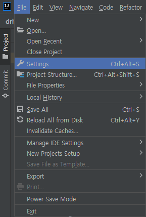 Fig 2. File -> Setting 3. Setting -> Code Style -> Schema 옆에 톱니 버튼 클릭 -> Impoert Schema -> intelliJ IDEA code style XML