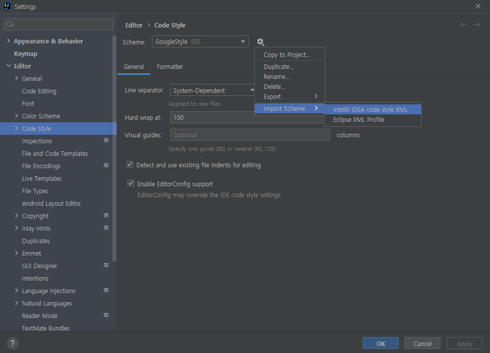 Fig 6. Import 완료 IntelliJ java code formatter in google style 설정이 완료 되었다.