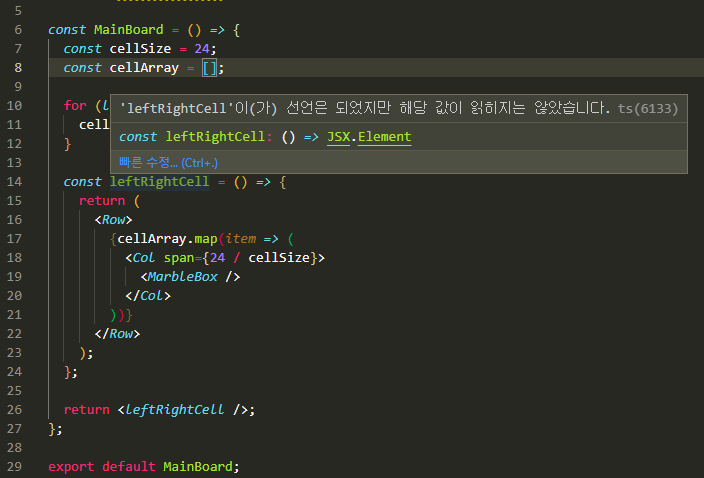 - 하지만 VScode 상에서 분명히 선언했던 컴포넌트가 해당 값이 사용되지 않고 있다는 표시가 되었다.