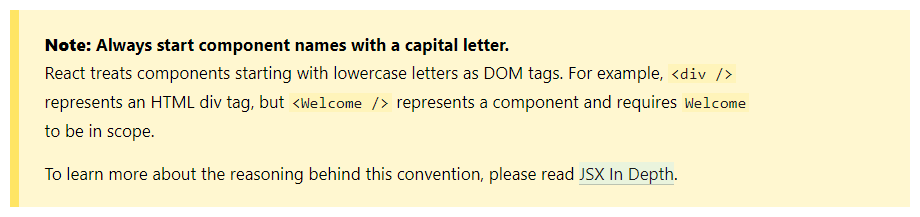 - 처음에 컴포넌트 이름은 컴포넌트를 나타내는 변수라서 어떤 형태는 JS에서 허용하는 변수명이면 된다고 생각했는데 리액트는 처음 문자가 대문자로 되어 있어야 컴포넌트로 인식한다. 아래 공식 문서에도 명시되어 있다.