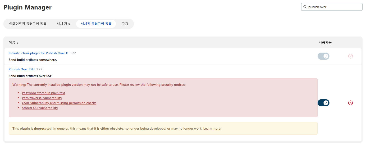 Fig. Publish Over SSH 가 Deprecated 되었다. (이미 설치되어 있기 때문이 검색이 됨) 따라서 설치 하기 위해서는 "publish-over-ssh.hpi" 파일을 다운로드 받아서 Jenkins에서 수동으로 설치해 주어야 한다.