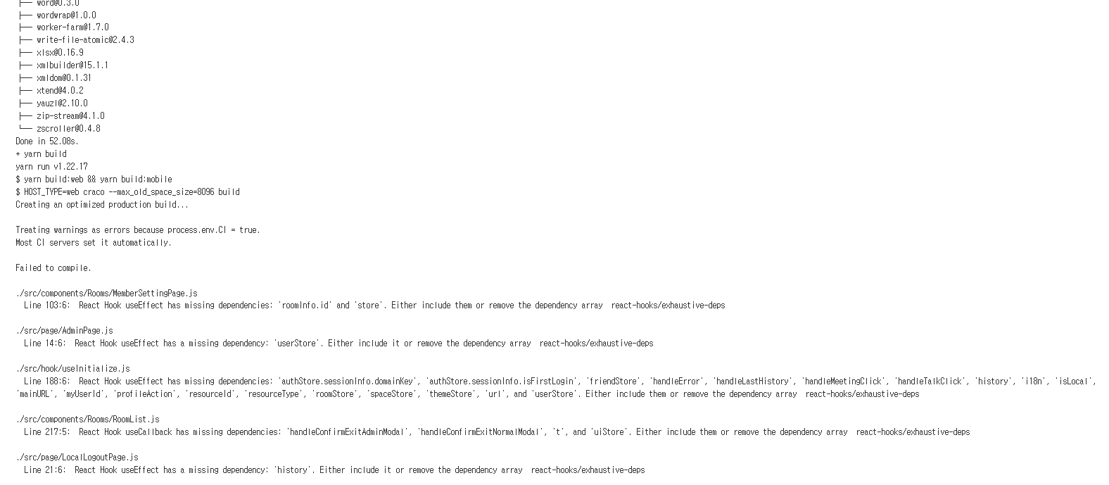 [Jenkins] React Build Error: Treating warnings as errors because process.env.CI = true.CICD 2022. 2. 10. 16:05Jenkins에서 yarn build로 React Project를 빌드하면 다음과 같은 에러가 발생한다.  Fig 1. React Build Error Treating warnings as errors because process.env.CI = true. Most CI servers set it automatically. Failed to compile.이 에러는 React project 내에 lint 에러가 존재 할 때 compile을 fail 시켜 버리기 때문이다. 코드 자채에는 문제가 없으므로 빌드가 되면 빌드 결과물에는 문제가 없다. 해결 방법Jenkins logs (Fig 1.)에 나와 있듯이 CI=true가 default로 설정 되어 있기 때문에 CI=false로 해주어야 React project 내에 lint error를 무시하고 빌드를 한다.  Fig 1. Jenkins 시스템 설정에서 Global properties로 CI를 false로 설정 Jenkins 관리 -> 시스템 설정 에 들어가서 Global properties에 CI = false 를 fig 1. 과 같이 설정해 준다. 'CICD' 카테고리의 다른 글